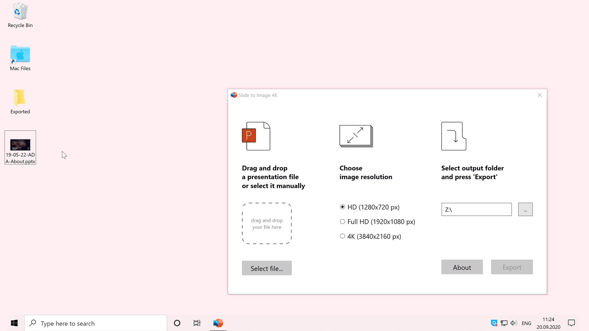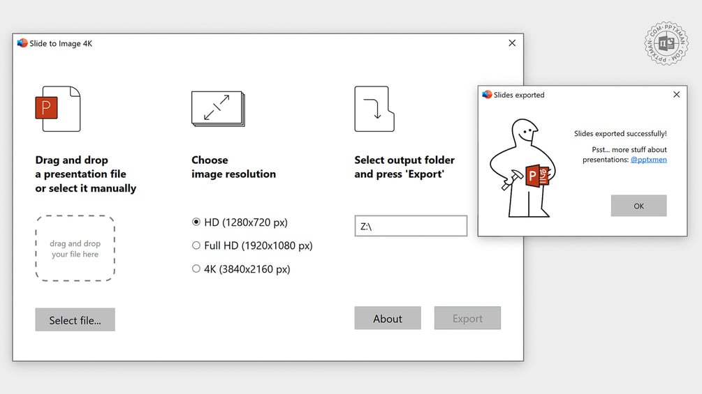 By default, Microsoft PowerPoint doesn't allow you to choose the resolution of exported slides. This small utility solves the issue: simply choose your pptx file, choose the resolution (up to 4K) and output folder.